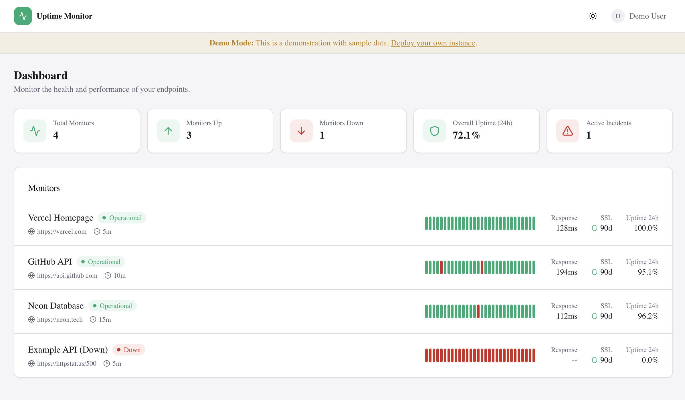 Clone it, deploy to Vercel, connect Neon and Resend, and you'll have your own uptime monitor running in minutes. The README walks through the full setup.